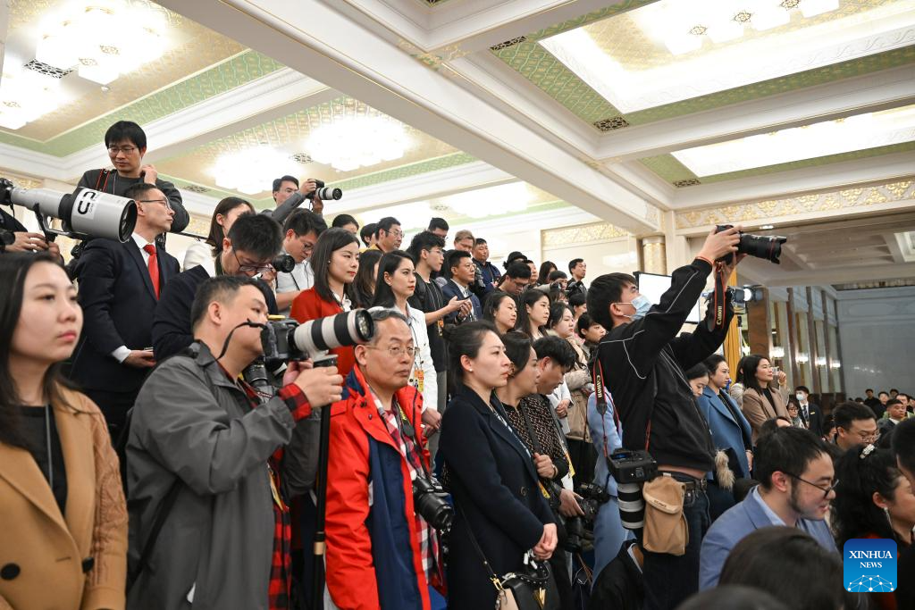 Journalists work during an interview attended by ministers after the closing meeting of the second session of the 14th National People's Congress (NPC) at the Great Hall of the People in Beijing, capital of China, March 11, 2024. (Xinhua/Mu Yu)