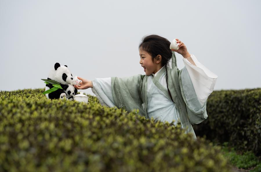 A child plays at a tea garden in Dehong Village of Naxi District, Luzhou City, southwest China's Sichuan Province, March 10, 2024. (Xinhua/Jiang Hongjing)