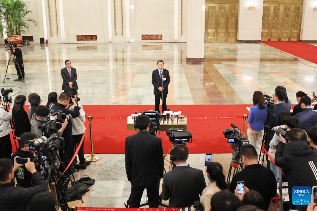Shen Changyu, head of the National Intellectual Property Administration of China, gives an interview after the closing meeting of the second session of the 14th National People's Congress (NPC) at the Great Hall of the People in Beijing, capital of China, March 11, 2024. (Xinhua/Liu Xu)