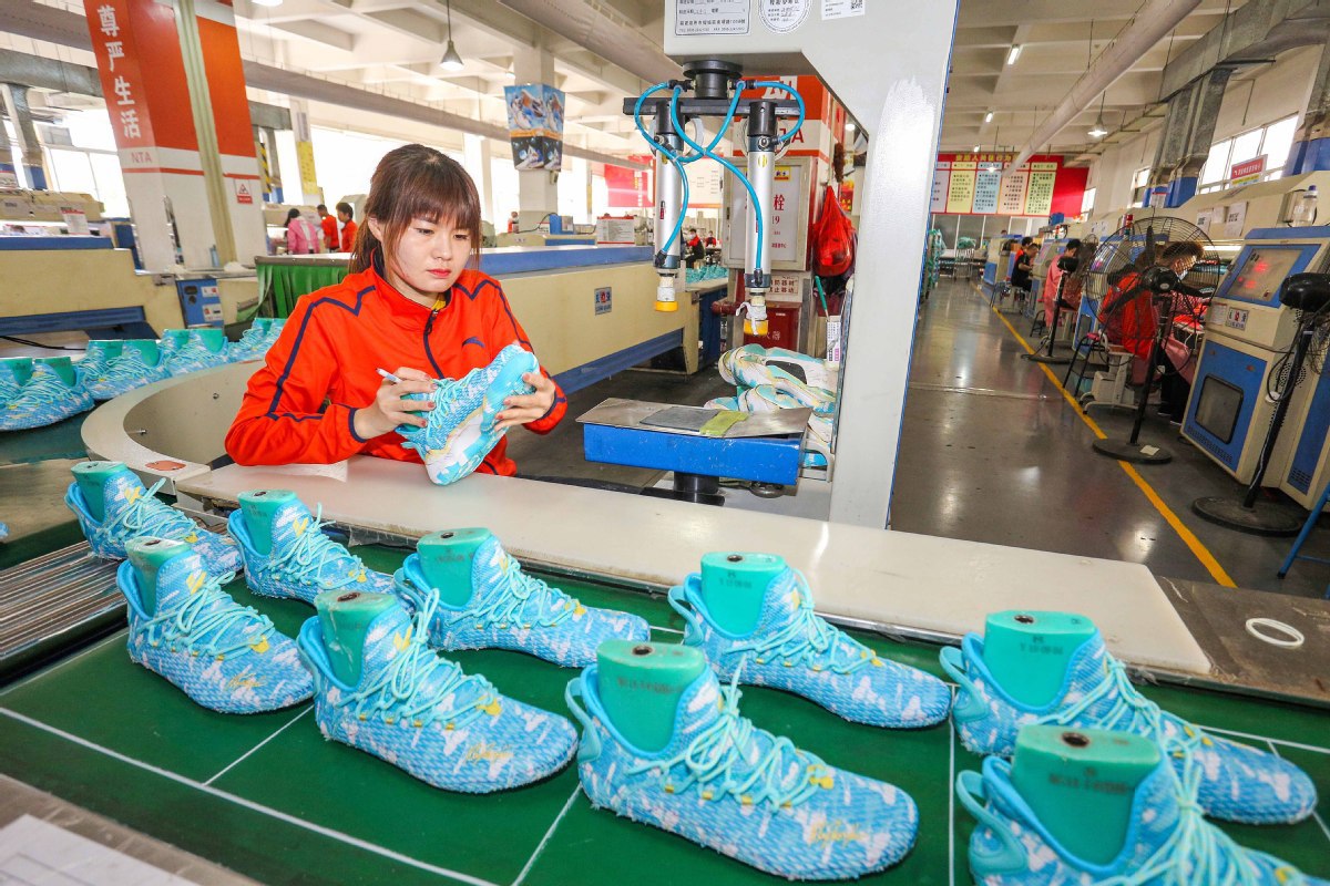 A worker operates on a footwear production line of Chinese sportswear brand Anta in Jinjiang, Fujian province, in February 2021. CHINA DAILY