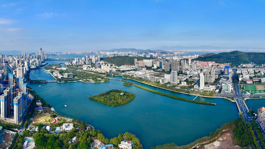 An aerial panoramic drone photo taken on Jan. 24, 2024 shows a view of Yundang Lake and its surroundings in Xiamen, southeast China's Fujian Province. (Xinhua/Jiang Kehong)
