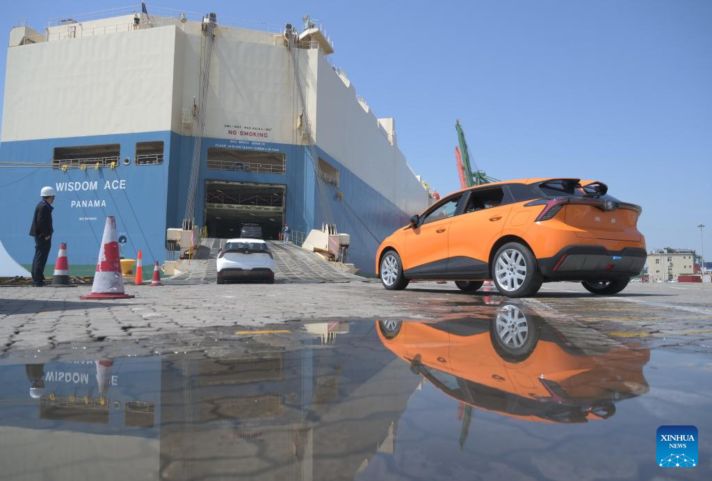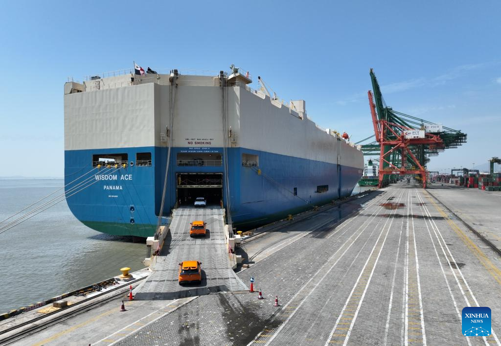Vehicles for export are being loaded into a ro-ro cargo vessel at Jiangyin terminal of Fuzhou Port in Fuzhou, southeast China's Fujian Province, March 12, 2024. (Xinhua/Lin Shanchuan)