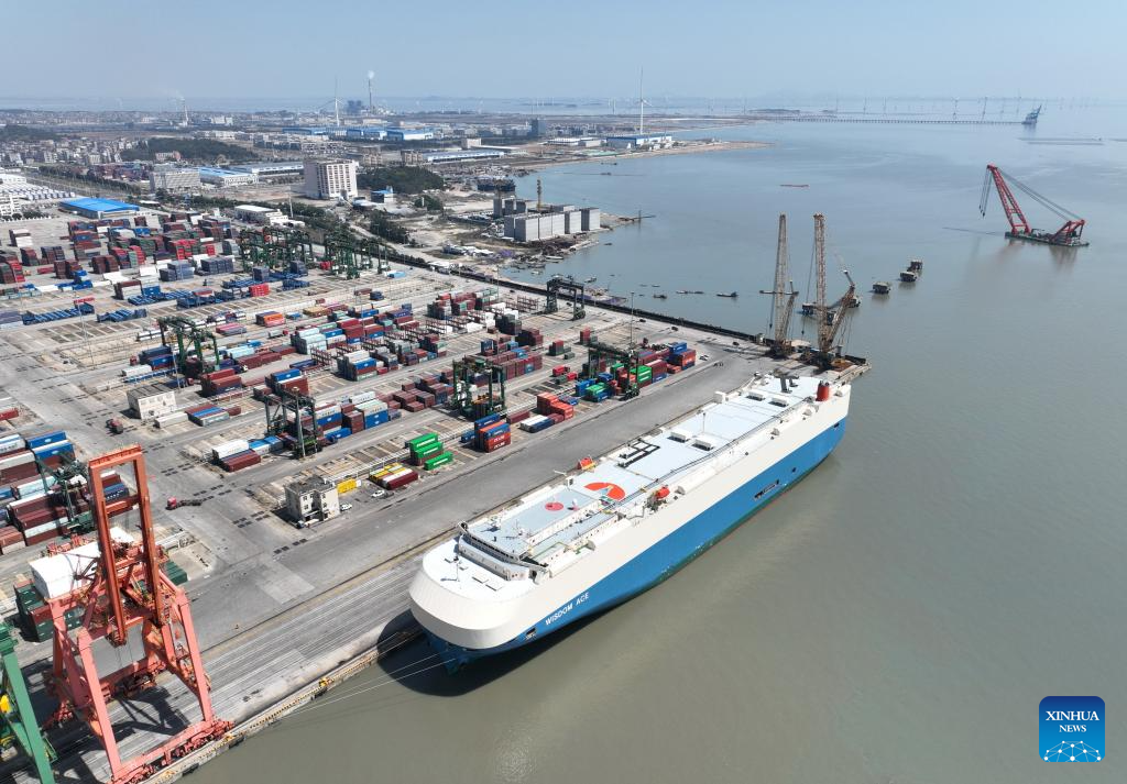 An aerial drone photo taken on March 12, 2024 shows the ro-ro cargo vessel "Wisdom Ace" docking at Jiangyin terminal of Fuzhou Port in Fuzhou, southeast China's Fujian Province. (Xinhua/Lin Shanchuan)