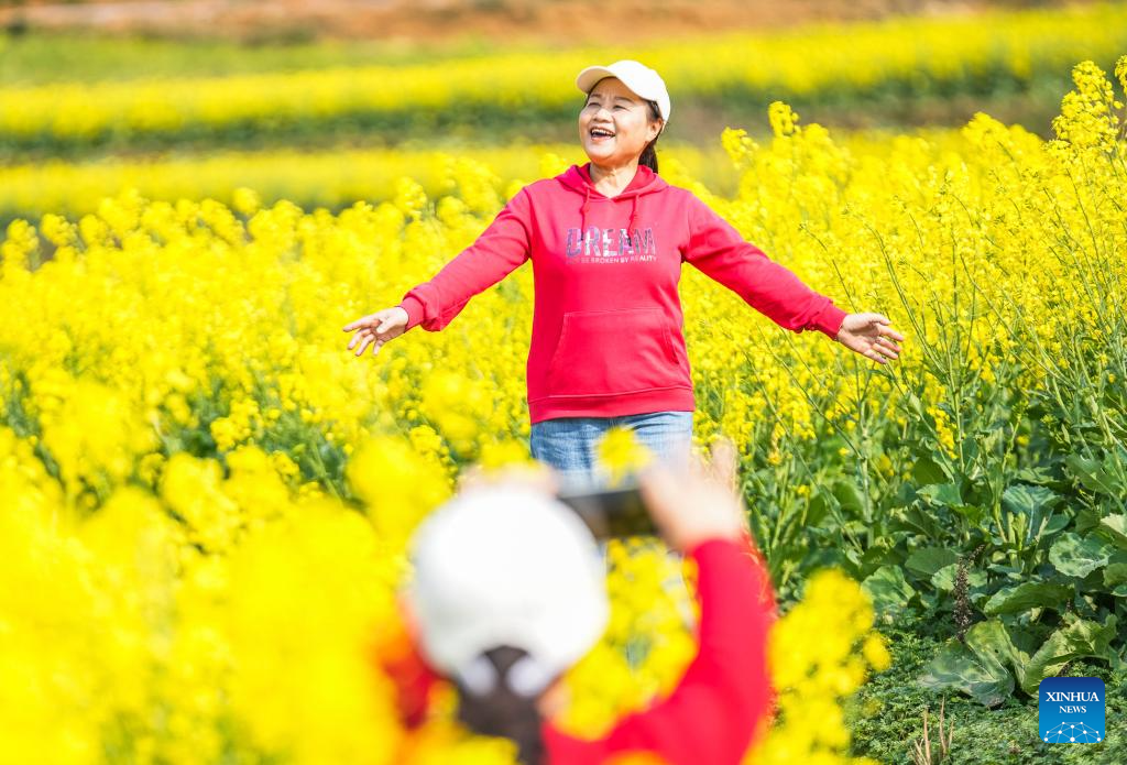 A tourist poses for photos in cole flower fields in Wayao Village of Liuzhi Special District in Liupanshui, southwest China's Guizhou Province, March 12, 2024. (Xinhua/Tao Liang)