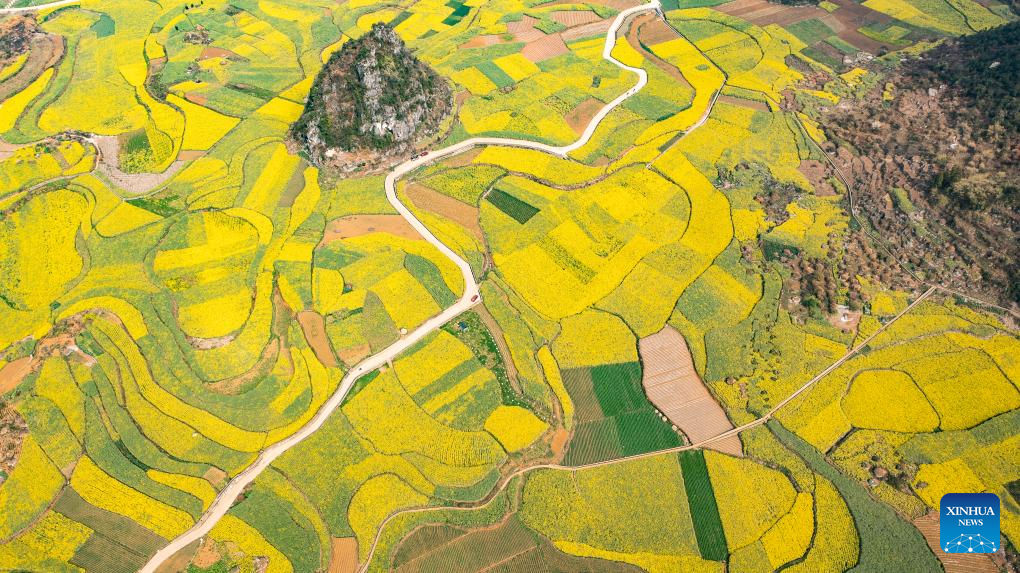 This aerial drone photo taken on March 12, 2024 shows cole flower fields in Dibo Village of Liuzhi Special District in Liupanshui, southwest China's Guizhou Province. (Xinhua/Tao Liang)