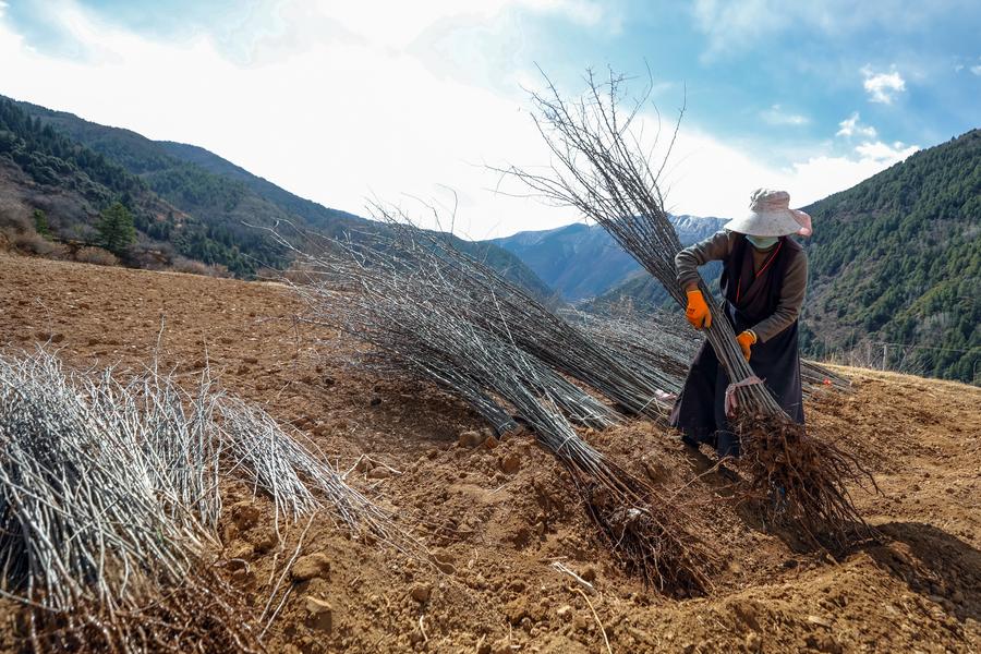 Villagers plant Cut-leaf Crabapple saplings in Daofu County, southwest China's Sichuan Province, March 10, 2024. (Xinhua/Shen Bohan)