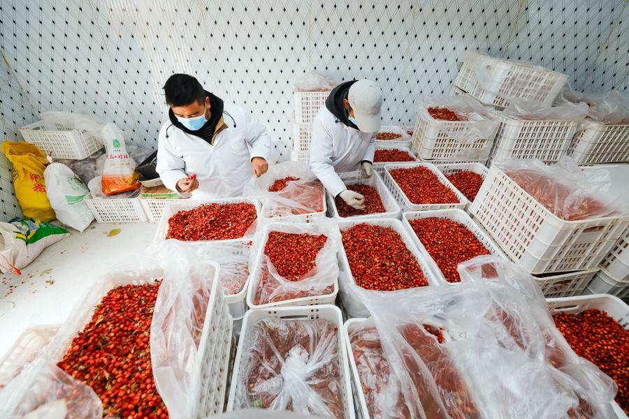 Workers select Cut-leaf Crabapple fruits at a cold storage warehouse of a food company in Daofu County, southwest China's Sichuan Province, March 10, 2024. (Xinhua/Shen Bohan)