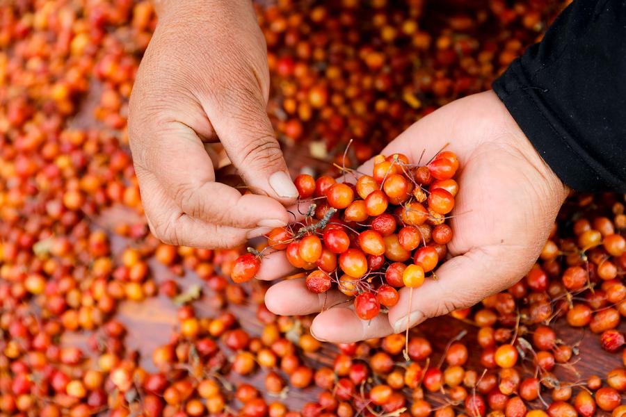 Workers select Cut-leaf Crabapple fruits at a food company in Daofu County, southwest China's Sichuan Province, March 10, 2024. (Xinhua/Shen Bohan)