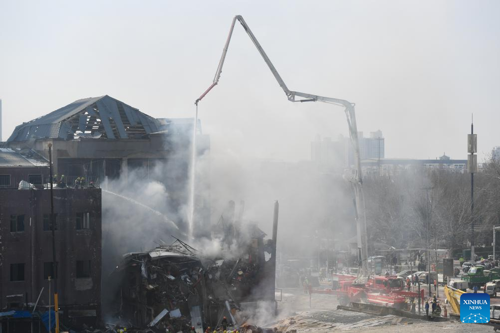 Rescuers work on the site of an explosion in Yanjiao of Sanhe City, north China's Hebei Province, March 13, 2024. (Xinhua/Ju Huanzong)