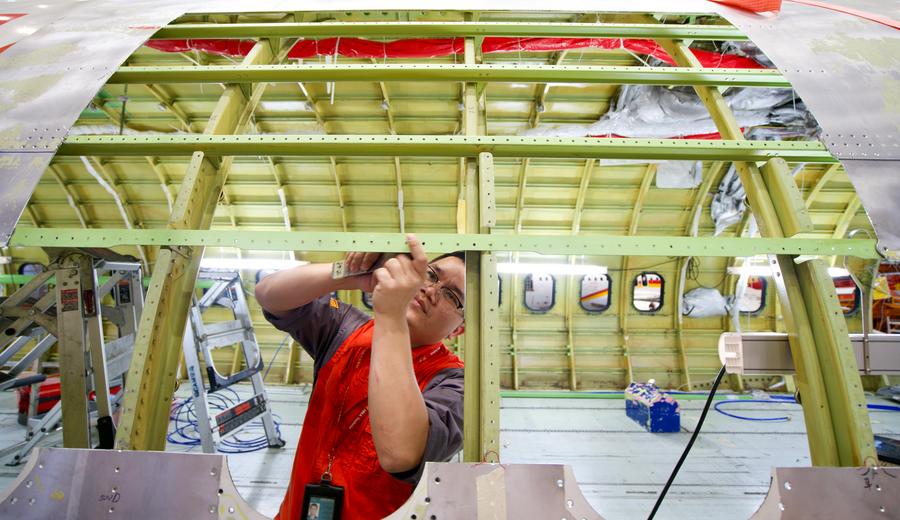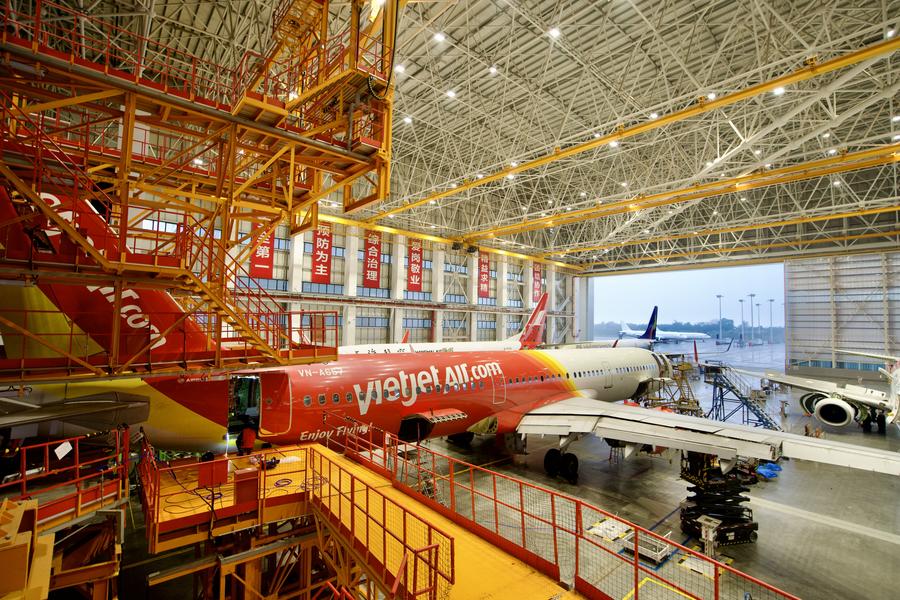 A worker of Grand China Aviation Maintenance Co., Ltd. (GCAM) maintains an airplane at a hangar of an aircraft maintenance base in south China's Hainan Province, March 11, 2024. (Xinhua/Zhang Liyun)