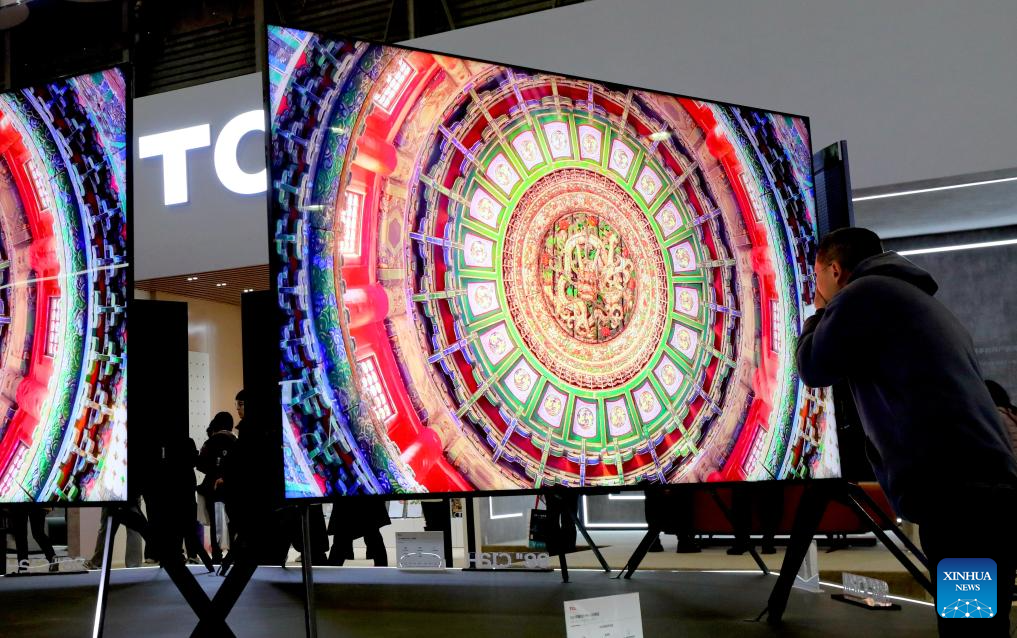 A visitor looks at the screen of a TV at TCL's booth during the 2024 Appliance & Electronics World Expo (AWE2024) in east China's Shanghai, March 14, 2024. With the theme of "Smartize the Future", the AWE2024 kicked off here on Thursday. The world's leading brands in the field of home appliances and consumer electronics gathered at the expo to showcase their latest innovations. (Xinhua/Fang Zhe)