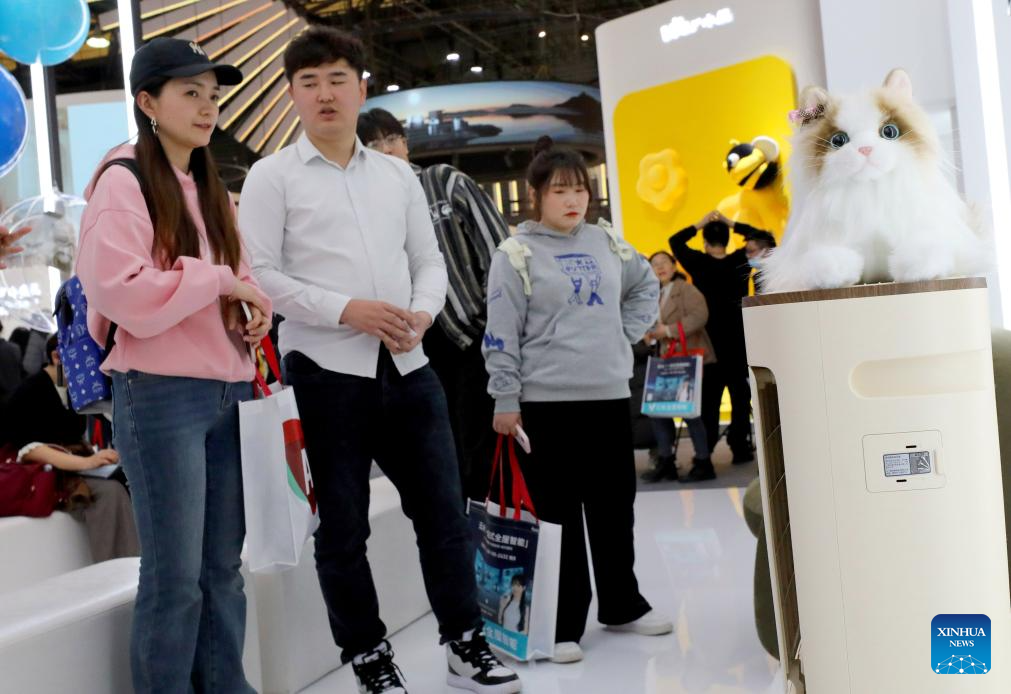 Visitors discuss about a Philips's air purifier for pet hair during the 2024 Appliance & Electronics World Expo (AWE2024) in east China's Shanghai, March 14, 2024. With the theme of "Smartize the Future", the AWE2024 kicked off here on Thursday. The world's leading brands in the field of home appliances and consumer electronics gathered at the expo to showcase their latest innovations. (Xinhua/Fang Zhe)