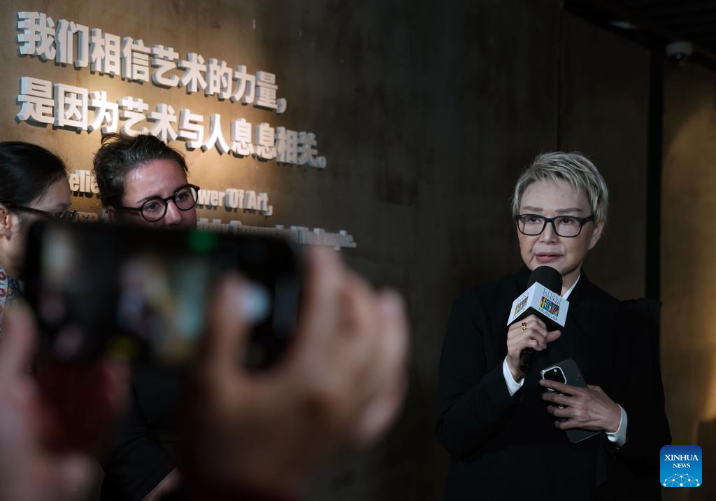 Loretta H. Yang, or Yang Huishan (R), curator of the exhibition and founder of Liuli China Museum, guides the media around the exhibition at the Liuli China Museum in Shanghai, east China, March 14, 2024. (Xinhua/Liu Ying)
