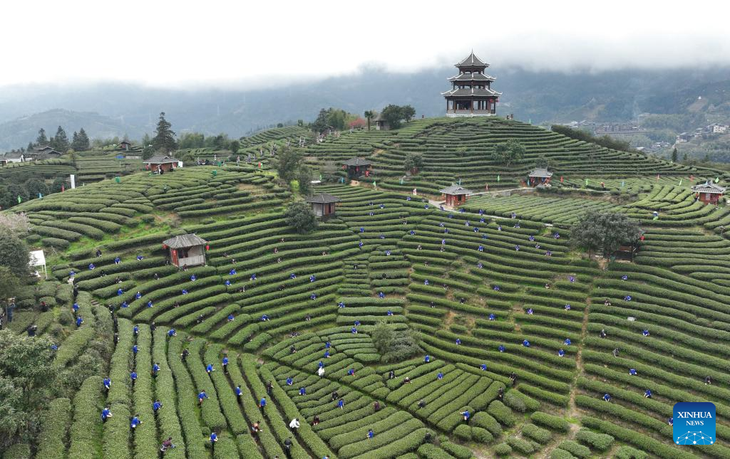 Villagers pick tea leaves in Buyang Village of Bajiang Township in Sanjiang Dong Autonomous County, south China's Guangxi Zhuang Autonomous Region, March 14, 2024. A two-day event promoting the tea culture kicked off in Sanjiang on Thursday. A series of activities, such as a ceremony marking the start of spring tea picking, tea art display, contracts signing, and technical exchange, are held to promote the high-quality development of local tea industry. (Xinhua/Huang Xiaobang)