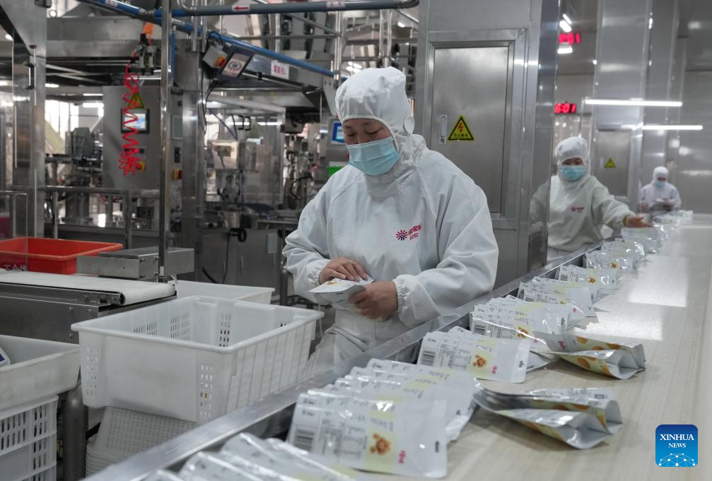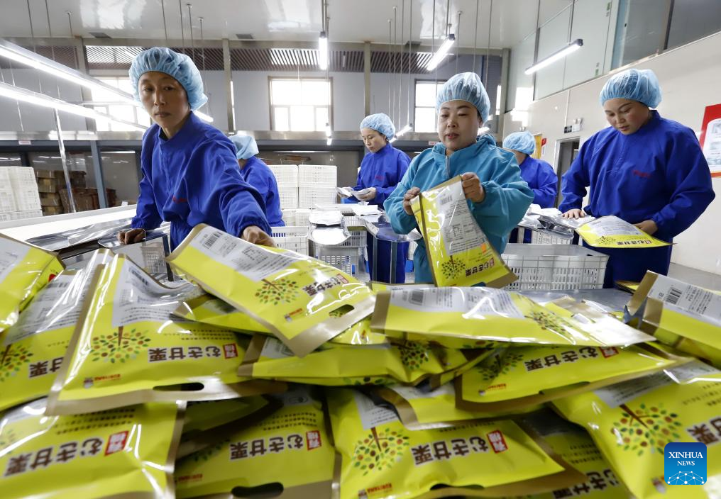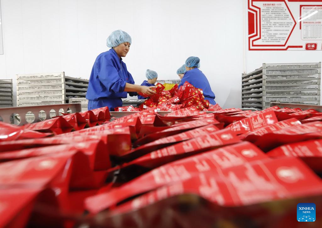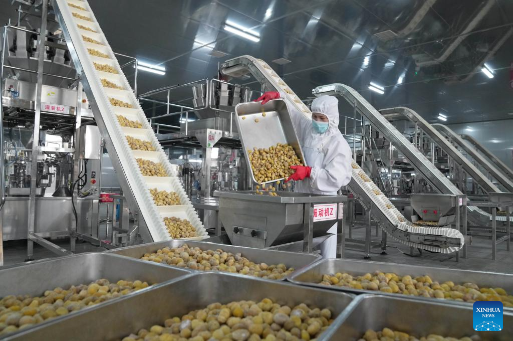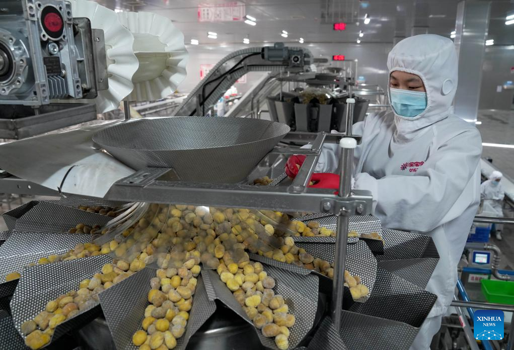 Staff members work at a chestnut processing workshop in Zunhua, north China's Hebei Province, March 14, 2024. Zunhua City has leveraged its abundant resources of chestnuts, peaches, walnuts and hawthorns to develop the agricultural products processing industry. (Xinhua/Yang Shiyao)