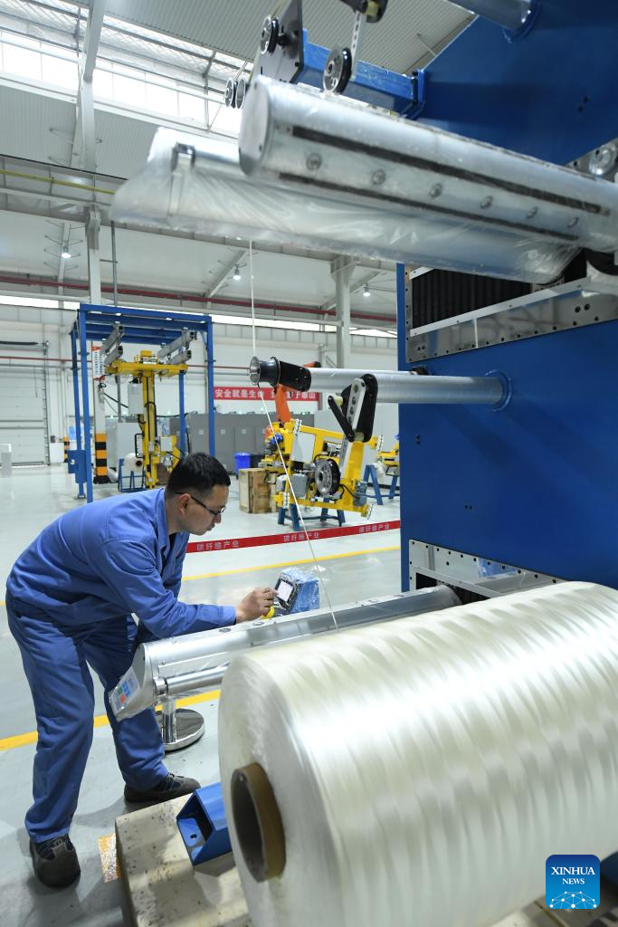 A worker operates an automated winder at a company in Keqiao District of Shaoxing, east China's Zhejiang Province, March 14, 2024. Keqiao District of Shaoxing is a cluster base for the textile industry, housing more than 8,000 textile businesses with an output value of over 100 billion yuan(about 13.9 billion U.S. dollars). In recent years, the district has promoted transformation and upgrading, introducing environmentally friendly machinery and innovative technologies. The local traditional industry, initially labor-intensive, is making a switch to a low-pollution, high-tech, and high-value advanced manufacturing segment. (Xinhua/Weng Xinyang)