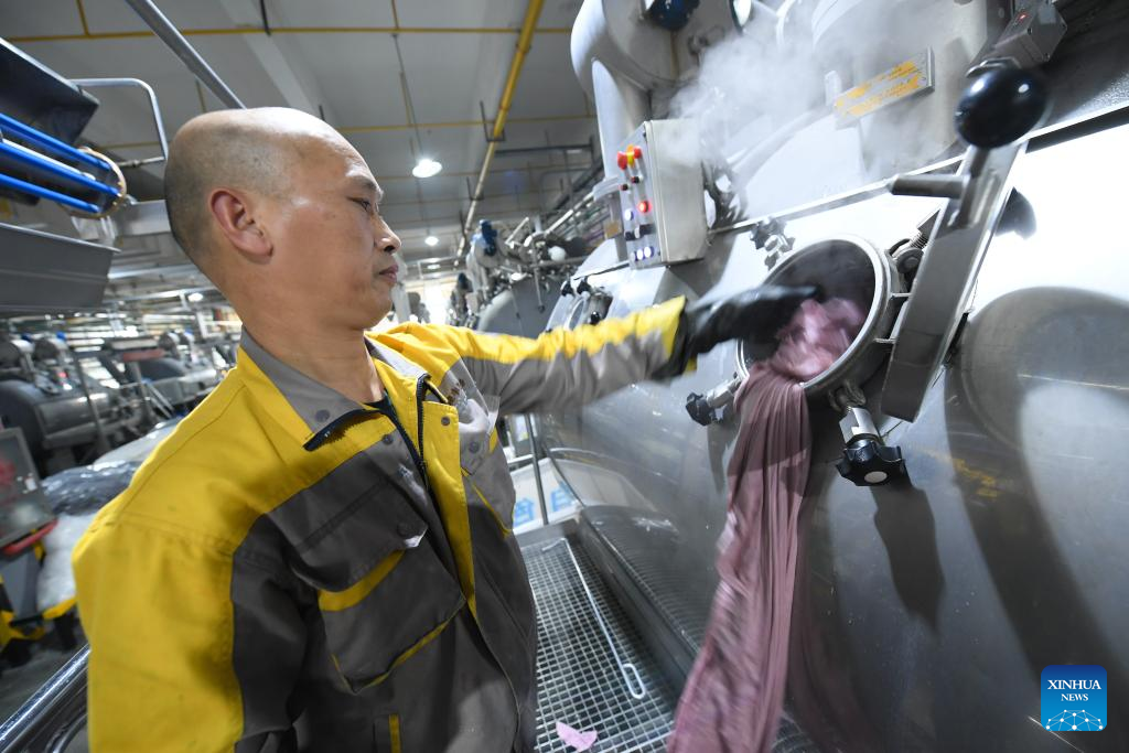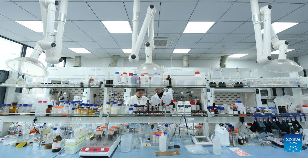 A researcher conducts experiments at a company in Keqiao District of Shaoxing, east China's Zhejiang Province, March 14, 2024. Keqiao District of Shaoxing is a cluster base for the textile industry, housing more than 8,000 textile businesses with an output value of over 100 billion yuan(about 13.9 billion U.S. dollars). In recent years, the district has promoted transformation and upgrading, introducing environmentally friendly machinery and innovative technologies. The local traditional industry, initially labor-intensive, is making a switch to a low-pollution, high-tech, and high-value advanced manufacturing segment. (Xinhua/Weng Xinyang)