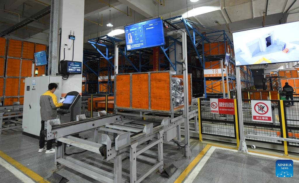 A worker deposits fabric products into a three-dimensional warehouse at a company in Keqiao District of Shaoxing, east China's Zhejiang Province, March 14, 2024. Keqiao District of Shaoxing is a cluster base for the textile industry, housing more than 8,000 textile businesses with an output value of over 100 billion yuan(about 13.9 billion U.S. dollars). In recent years, the district has promoted transformation and upgrading, introducing environmentally friendly machinery and innovative technologies. The local traditional industry, initially labor-intensive, is making a switch to a low-pollution, high-tech, and high-value advanced manufacturing segment. (Xinhua/Weng Xinyang)