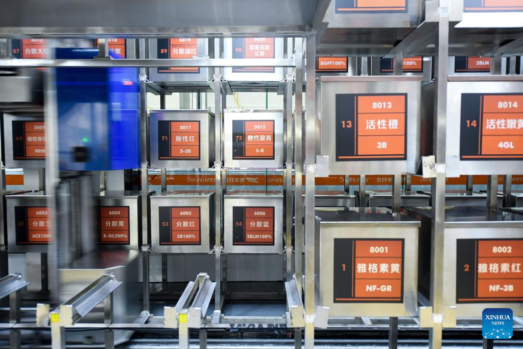 Robots handle dyes on an automated weighing and mixing system at a company in Keqiao District of Shaoxing, east China's Zhejiang Province, March 14, 2024. Keqiao District of Shaoxing is a cluster base for the textile industry, housing more than 8,000 textile businesses with an output value of over 100 billion yuan(about 13.9 billion U.S. dollars). In recent years, the district has promoted transformation and upgrading, introducing environmentally friendly machinery and innovative technologies. The local traditional industry, initially labor-intensive, is making a switch to a low-pollution, high-tech, and high-value advanced manufacturing segment. (Xinhua/Weng Xinyang)