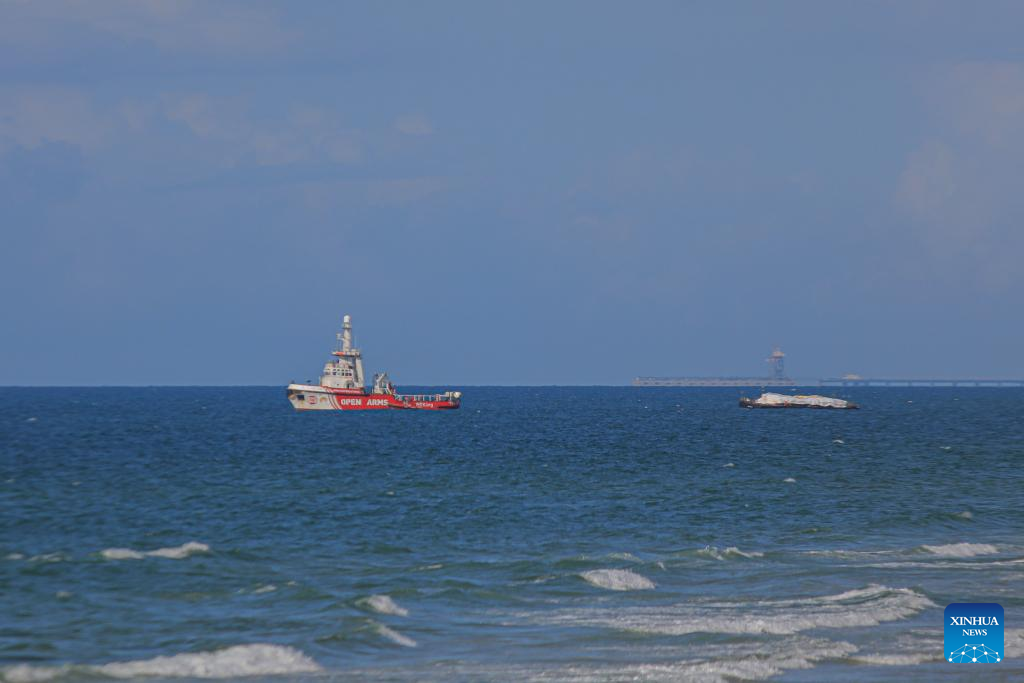A ship, manned by the Spanish aid organization Open Arms, is seen off the shore of central Gaza Strip, on March 15, 2024. The first aid ship, traveling through the Cyprus-Gaza humanitarian maritime corridor, reached the coast of the Palestinian enclave on Friday and began offloading its cargo, Palestinian sources said. (Photo by Yasser Qudih/Xinhua)