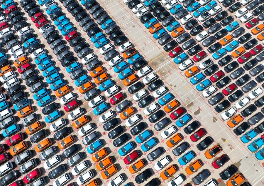 An aerial drone photo taken on March 12, 2024 shows vehicles for export parking at Jiangyin terminal of Fuzhou Port in Fuzhou, southeast China's Fujian Province. (Xinhua/Lin Shanchuan)