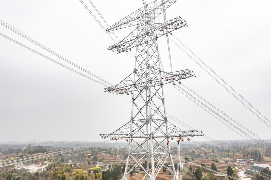 A drone photo taken on March 17, 2024 shows technicians working at the construction site of the Sichuan-Chongqing 1,000kV UHV AC project in Shaoyun Town of Tongliang District, southwest China's Chongqing. (Xinhua/Huang Wei)