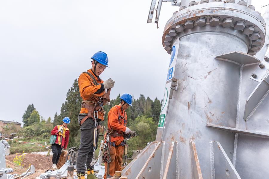 Technicians work at the construction site of the Sichuan-Chongqing 1,000kV UHV AC project in Shaoyun Town of Tongliang District, southwest China's Chongqing, March 17, 2024. (Xinhua/Huang Wei)