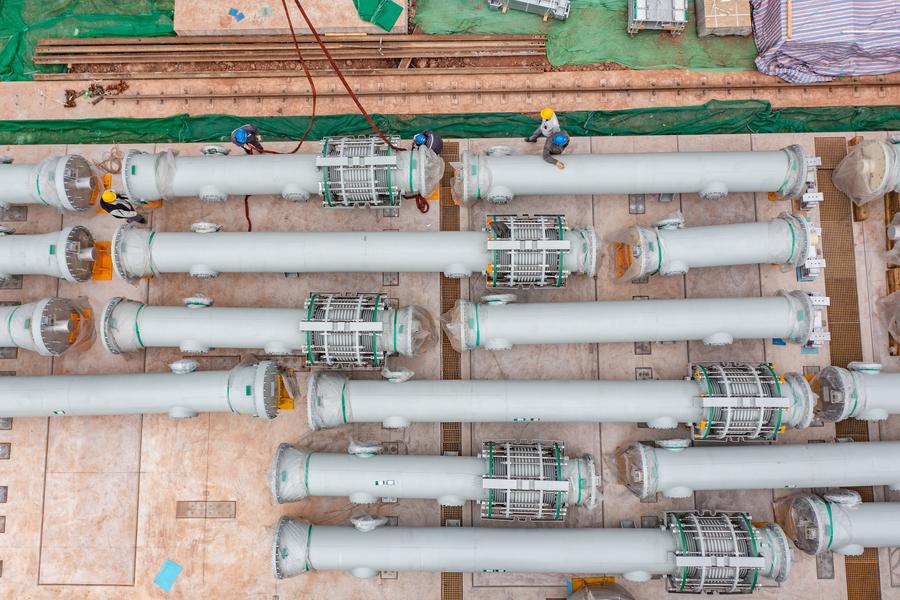 Workers install insulators at the construction site of the Sichuan-Chongqing 1,000kV UHV AC project in Shaoyun Town of Tongliang District, southwest China's Chongqing, March 17, 2024. (Xinhua/Huang Wei)