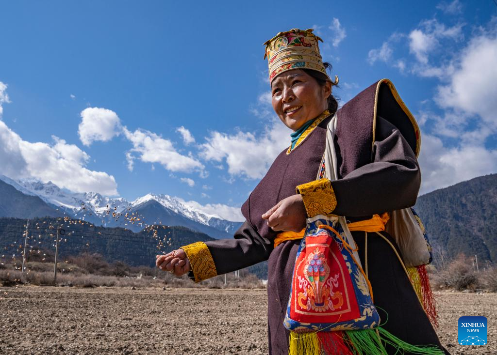 Farmers participate in a ceremony marking the start of spring farming in Gyaimain Village in Qonggyai County of Shannan, southwest China's Xizang Autonomous Region, March 16, 2024. (Xinhua/Tenzing Nima Qadhup)