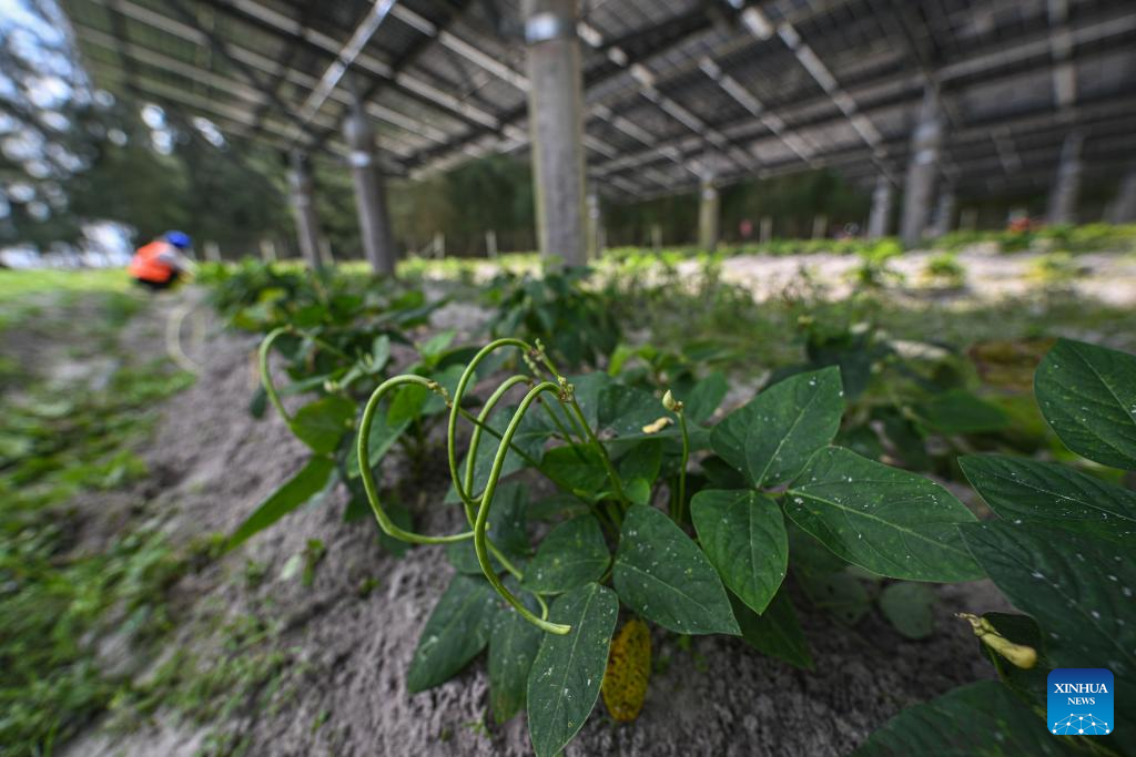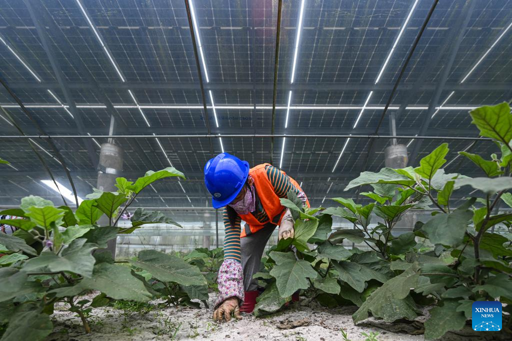An aerial drone photo taken on March 15, 2024 shows a photovoltaic power station and vegetable greenhouses at Wangtangnan Village of Wengtian Town in Wenchang City, south China's Hainan Province. (Xinhua/Pu Xiaoxu)
