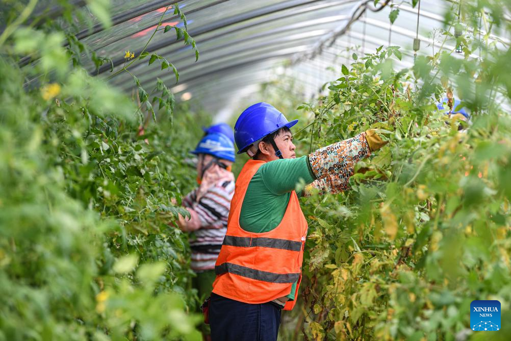 Villagers work in a greenhouse at Wangtangnan Village of Wengtian Town in Wenchang City, south China's Hainan Province, March 15, 2024. (Xinhua/Pu Xiaoxu)