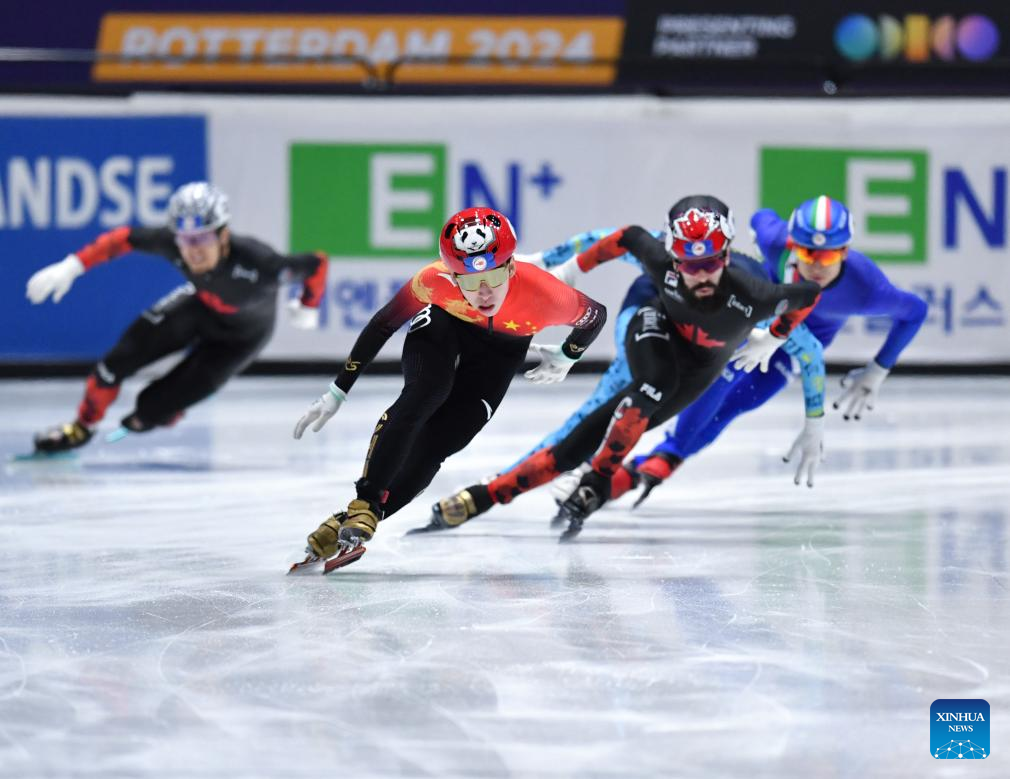 Lin Xiaojun (1st L) of China competes during the men's 500m Final A at the ISU World Short Track Speed Skating Championships 2024 in Rotterdam, the Netherlands, March 16, 2024. (Xinhua/Lian Yi)