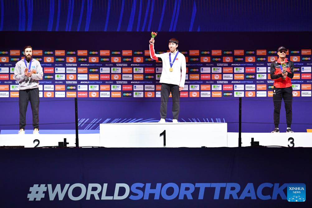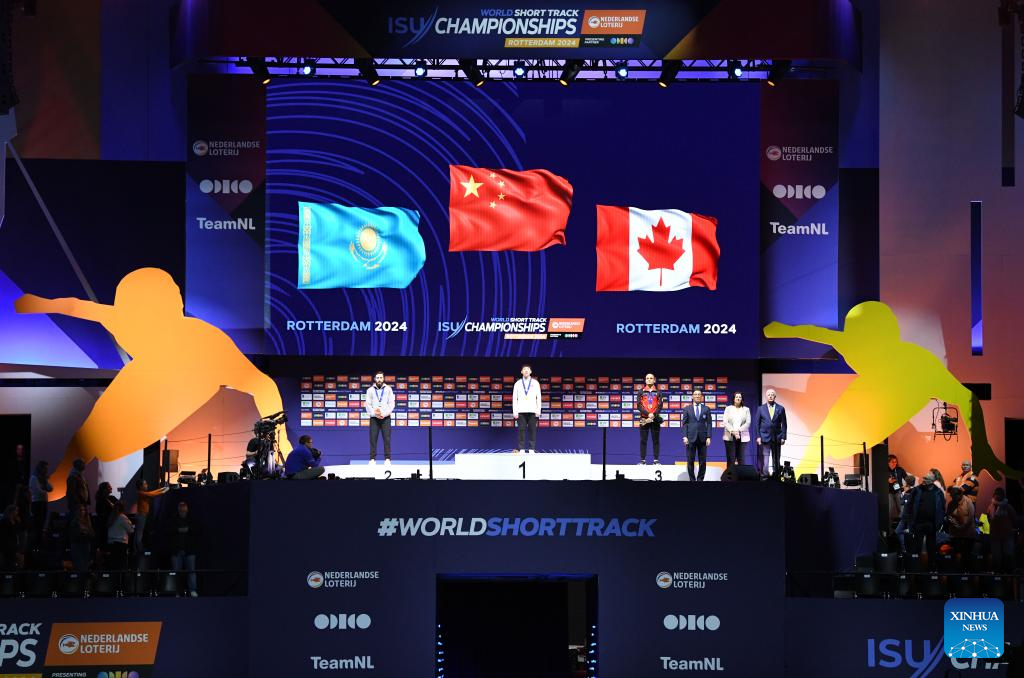 Gold medalist Lin Xiaojun (C) of China, silver medalist Denis Nikisha (L) of Kazakhstan and bronze medalist Jordan Pierre-Gilles of Canada attend the awarding ceremony of the men's 500m at the ISU World Short Track Speed Skating Championships 2024 in Rotterdam, the Netherlands, March 16, 2024. (Xinhua/Lian Yi)