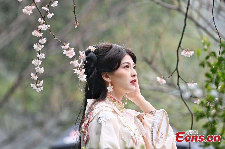 Visitors in Hanfu (a traditional Chinese costume) pose for a photo amid cherry blossoms at the Wangyue park in Changsha, central China's Hunan Province, March 17, 2024. (Photo: China News Service/Yang Huafeng)