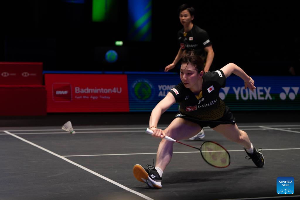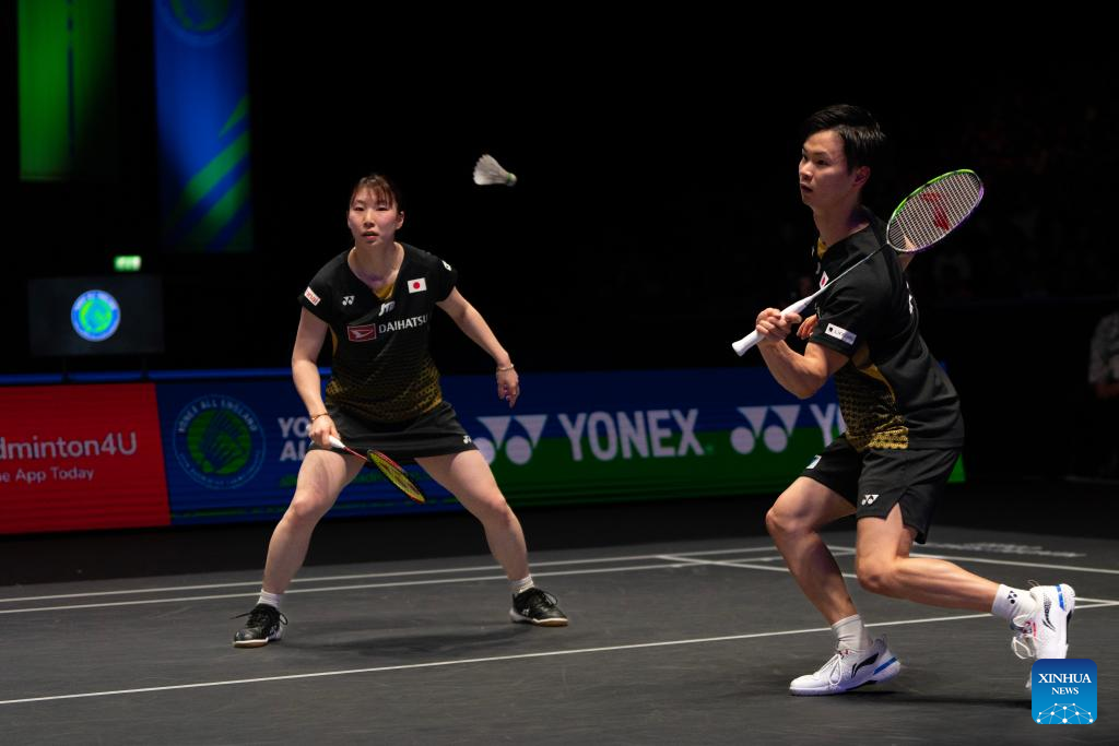 Watanabe Yuta/Higashino Arisa (L) of Japan compete during the mixed doubles final against Zheng Siwei/Huang Yaqiong of China at All England Open Badminton Championships 2024 in Birmingham, Britain, March 17, 2024. (Xinhua)