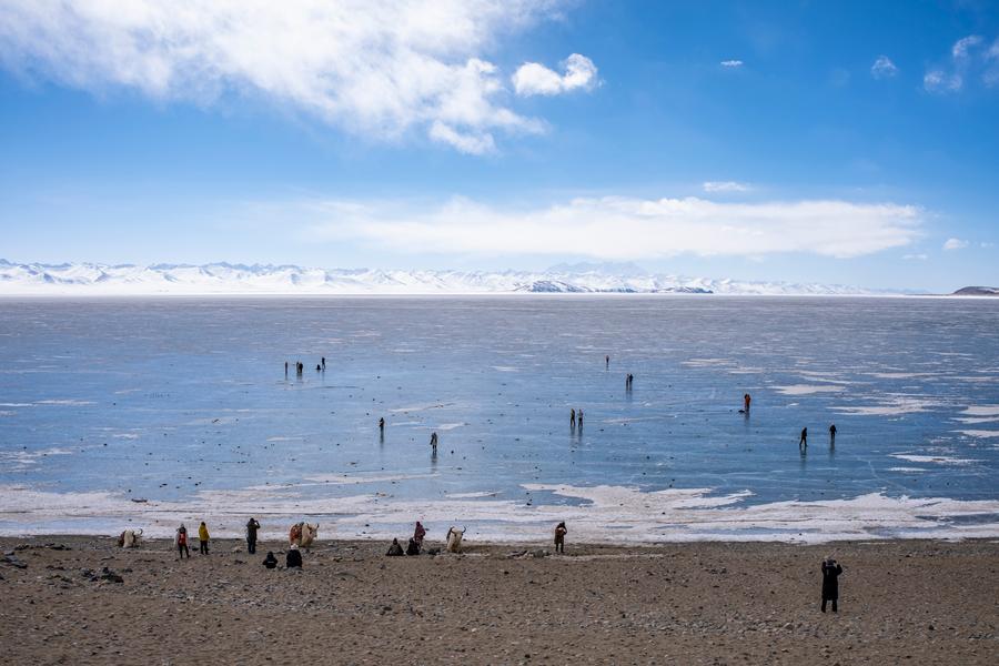 Tourists have fun on the frozen Lake Namtso in southwest China's Xizang Autonomous Region, Feb. 8, 2024. (Xinhua/Sun Fei)