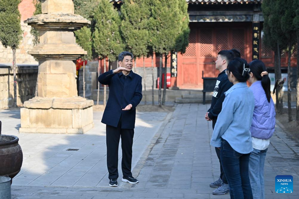 Zhang Yufei (1st L) guides tourists in Faxing Temple in Zhangzi County, north China's Shanxi Province, March 12, 2024. Faxing Temple, with a history of more than 1,000 years, is nestled on Cuiyun Mountain of Zhangzi County. In 1988, the temple was listed as a national key cultural relics protection site. (Xinhua/Yang Chenguang)