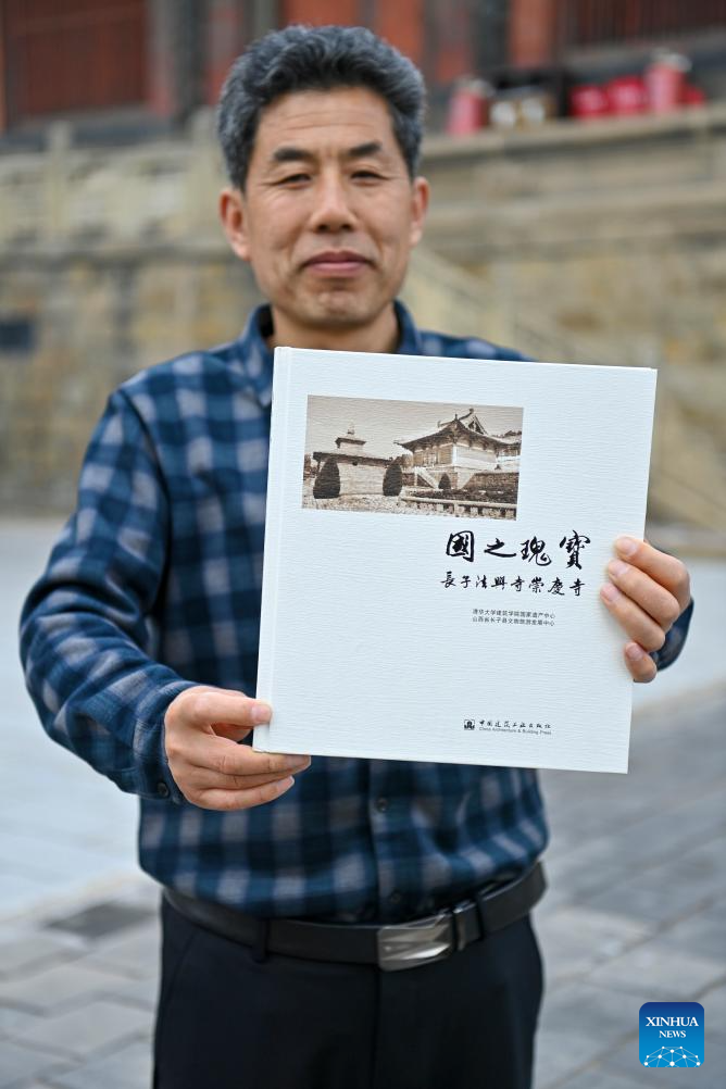 Zhang Yufei displays a book he edited in Faxing Temple in Zhangzi County, north China's Shanxi Province, March 15, 2024. Faxing Temple, with a history of more than 1,000 years, is nestled on Cuiyun Mountain of Zhangzi County. In 1988, the temple was listed as a national key cultural relics protection site. (Xinhua/Yang Chenguang)
