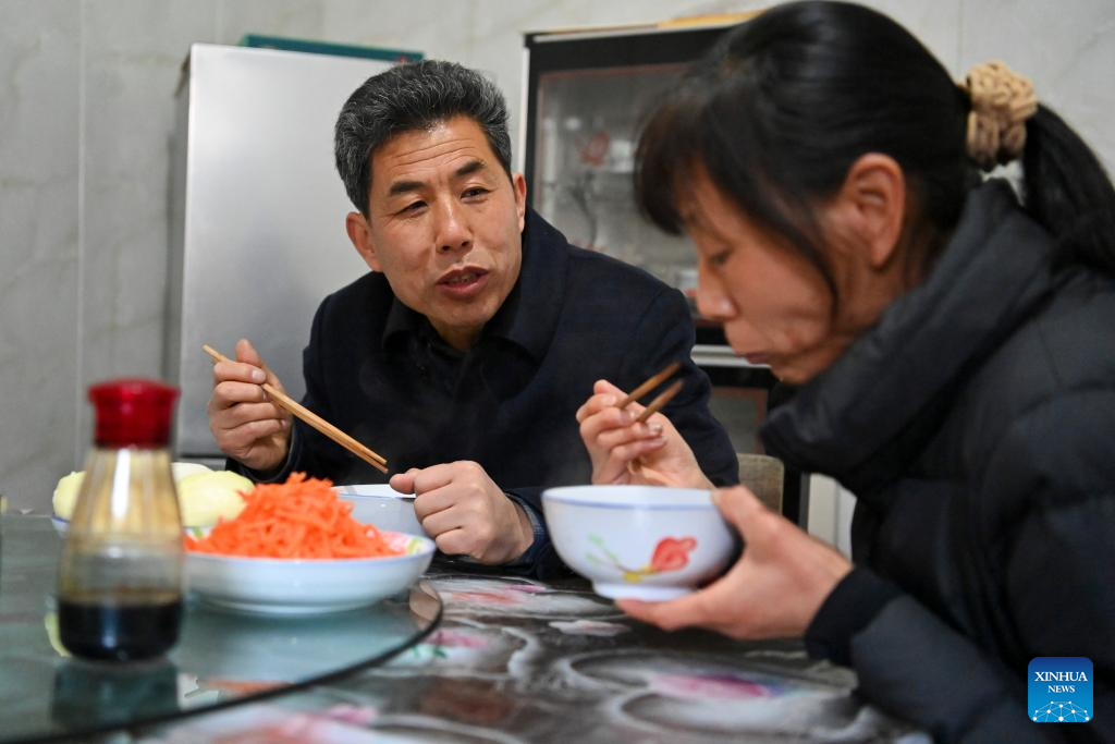 Zhang Yufei (L) and his wife Liu Hailing have a meal near Faxing Temple in Zhangzi County, north CHina's Shanxi Province, March 12, 2024. Faxing Temple, with a history of more than 1,000 years, is nestled on Cuiyun Mountain of Zhangzi County. In 1988, the temple was listed as a national key cultural relics protection site. (Xinhua/Yang Chenguang)
