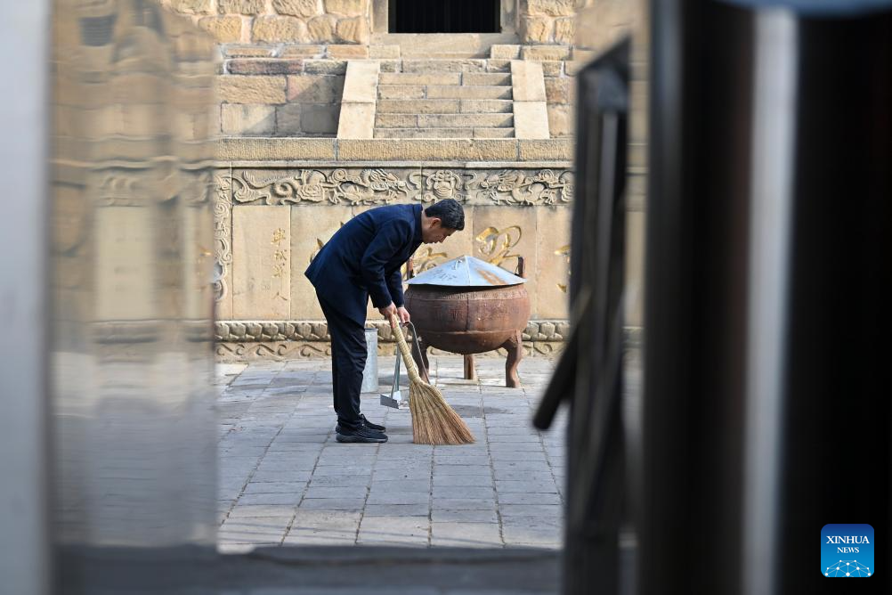 Zhang Yufei does cleaning work in Faxing Temple in Zhangzi County, north China's Shanxi Province, March 16, 2024. Faxing Temple, with a history of more than 1,000 years, is nestled on Cuiyun Mountain of Zhangzi County. In 1988, the temple was listed as a national key cultural relics protection site. (Xinhua/Yang Chenguang)