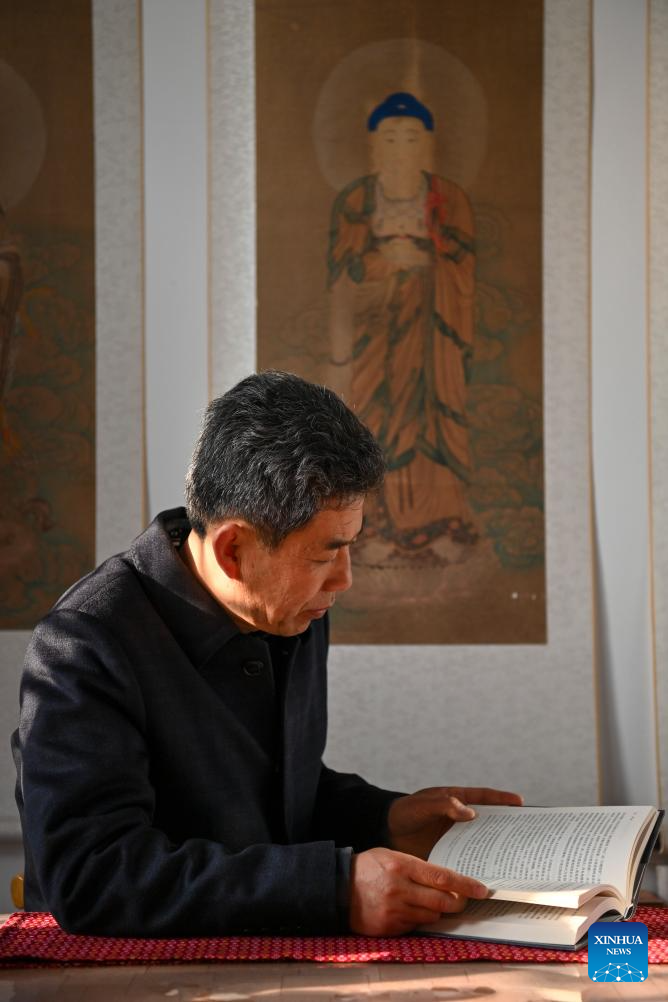 Zhang Yufei reads a book at his home near Faxing Temple in Zhangzi County, north China's Shanxi Province, March 12, 2024. Faxing Temple, with a history of more than 1,000 years, is nestled on Cuiyun Mountain of Zhangzi County. In 1988, the temple was listed as a national key cultural relics protection site. (Xinhua/Yang Chenguang)