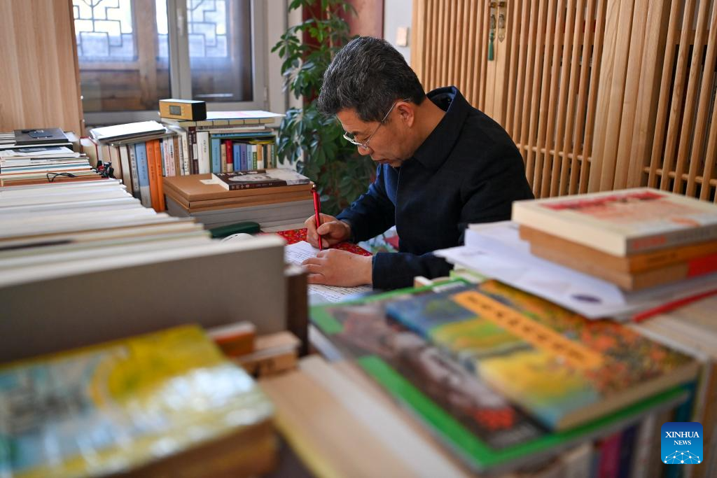 Zhang Yufei arranges research documents at his home near Faxing Temple in Zhangzi County, north China's Shanxi Province, March 12, 2024. Faxing Temple, with a history of more than 1,000 years, is nestled on Cuiyun Mountain of Zhangzi County. In 1988, the temple was listed as a national key cultural relics protection site. (Xinhua/Yang Chenguang)