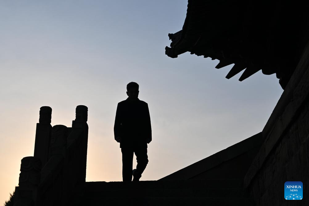 Zhang Yufei patrols in Faxing Temple in Zhangzi County, north China's Shanxi Province, March 12, 2024. Faxing Temple, with a history of more than 1,000 years, is nestled on Cuiyun Mountain of Zhangzi County. In 1988, the temple was listed as a national key cultural relics protection site. (Xinhua/Yang Chenguang)