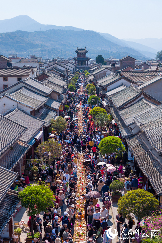 Tourists participate in a long-table banquet in Weishan county, Dali Bai Autonomous Prefecture, southwest China's Yunnan Province. (People's Daily Online/Xu Qian)