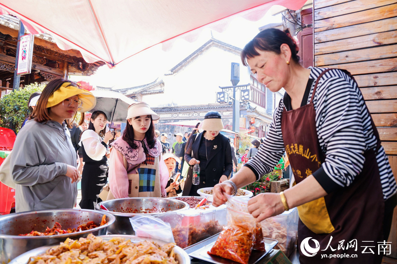 Tourists buy snacks during the 11th China Dali Weishan Snack Festival in Weishan county, Dali Bai Autonomous Prefecture, southwest China's Yunnan Province. (People's Daily Online/Xu Qian)