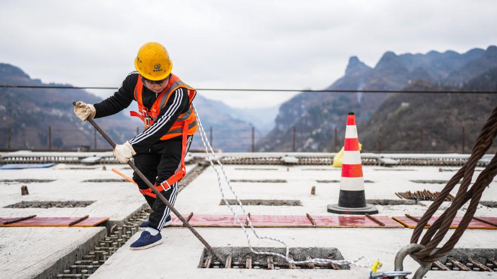 A worker works at the construction site of Baishuihe bridge on Nayong-Qinglong Expressway in southwest China's Guizhou Province, March 19, 2024. The Baishuihe bridge, with a length of 833.5 meters, has completed the bridge deck installation recently. (Xinhua/Tao Liang)
