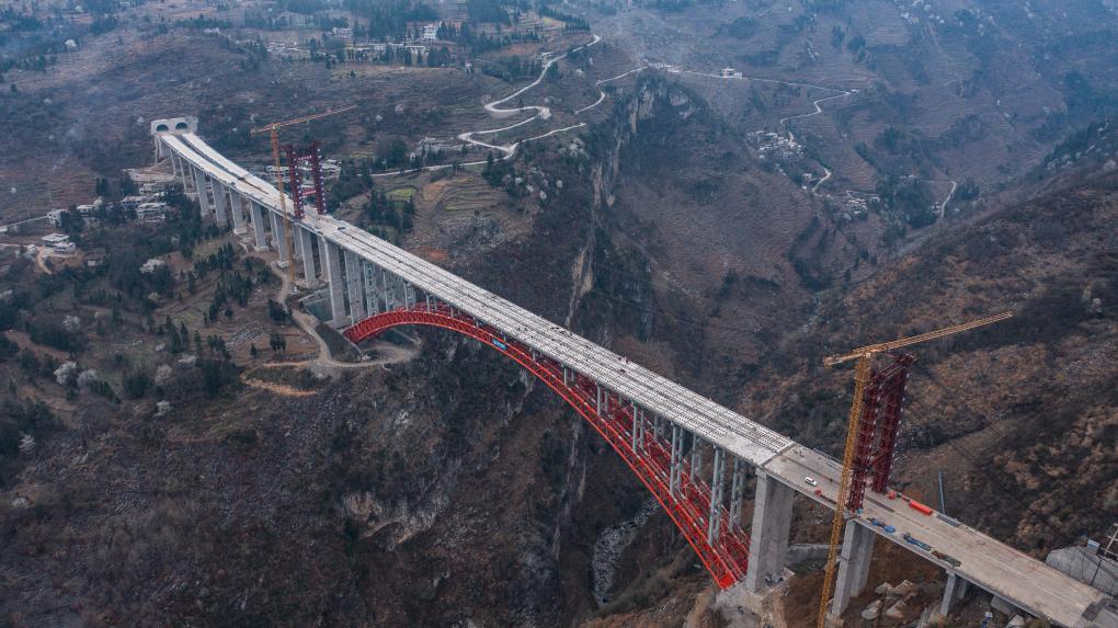An aerial drone photo taken on March 19, 2024 shows the construction site of Baishuihe bridge on Nayong-Qinglong Expressway in southwest China's Guizhou Province. The Baishuihe bridge, with a length of 833.5 meters, has completed the bridge deck installation recently. (Xinhua/Tao Liang)