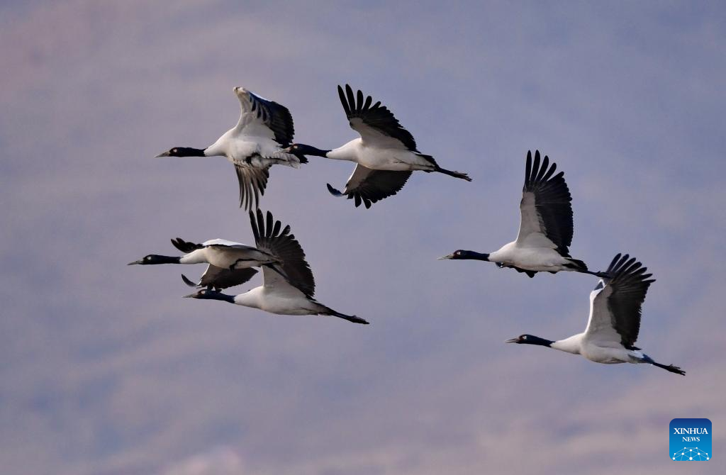 Black-necked cranes fly at a reservoir in Lhunzhub County of Lhasa, southwest China's Xizang Autonomous Region, March 17, 2024. As the temperature gradually rises, black-necked cranes have started their migration from the reservoir in Lhunzhub County. The black-necked crane, a species under first-class state protection in China, mainly inhabits plateau meadows and marshes at an altitude of 2,500 to 5,000 meters. (Xinhua/Jigme Dorje)