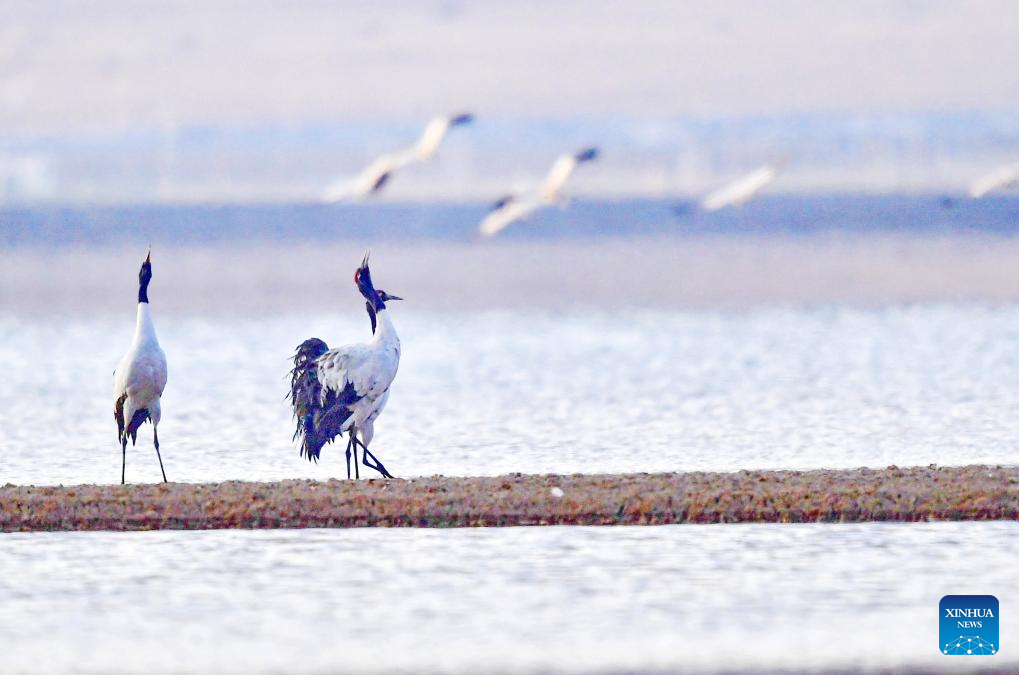 Black-necked cranes are seen at a reservoir in Lhunzhub County of Lhasa, southwest China's Xizang Autonomous Region, March 17, 2024. As the temperature gradually rises, black-necked cranes have started their migration from the reservoir in Lhunzhub County. The black-necked crane, a species under first-class state protection in China, mainly inhabits plateau meadows and marshes at an altitude of 2,500 to 5,000 meters. (Xinhua/Jigme Dorje)
