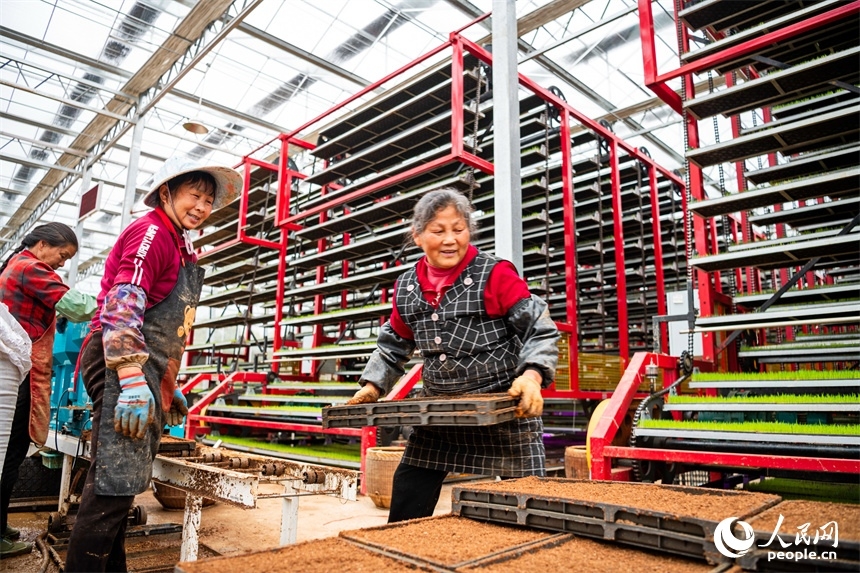 Workers cultivate early-season rice seedlings at an intelligent seedling breeding center in Hengshi town, Nankang district, Ganzhou, east China's Jiangxi Province. (People's Daily Online/Zhu Haipeng)